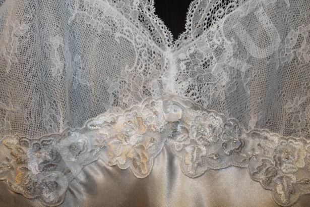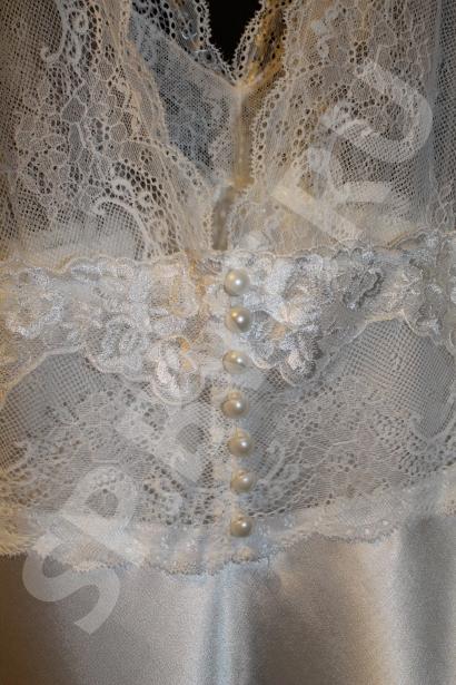 Фото 1 - спинка, украшена рядом жемчуженок, очень красиво и празднично, кстати во сне совсем не мешают, как я сначала подумала ))) Фото 3 - перед, столько кружева и вышивки, ощущаешь себя настоящей принцессой