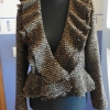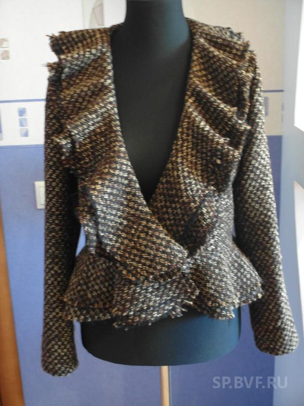 Наконец-то дошли руки до ткани-букле, а то нахапала кучу отрезов, а времени шить не хватает. Ткань очень сыпется, без оверлока не обойтись, но качество хорошее, шерсть присутствует, жакет получился очень теплый. Я давно на этот фасон из Бурды смотрела -воланы не надо обрабатывать -прикольно получилось (брала 2м). Хотела еще дозаказать и и юбку сшить, но подумала перебор будет.