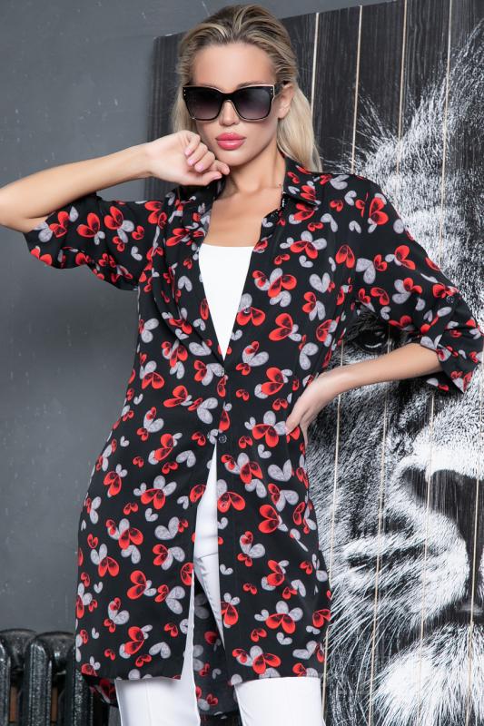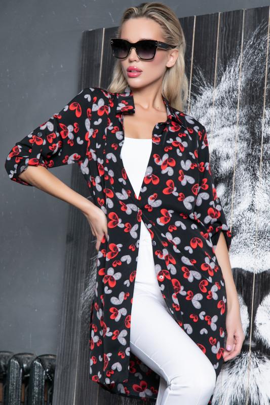 Артикул 884194593: Рубашка "Леона" (сердечки черный) https://elza-nsk.ru/collection/novinki/product/rubashka-leona-serdechki-chernyy | Хит сезона! Отличный осенний вариант. Рубашка удлиненная с разрезами. Ворот на стойке, по переду планка на пуговицах. Рукав до локтя с патой. (Длинны: 44-93см; 46-94см; 48-95см; 50-96см; 52-98см)